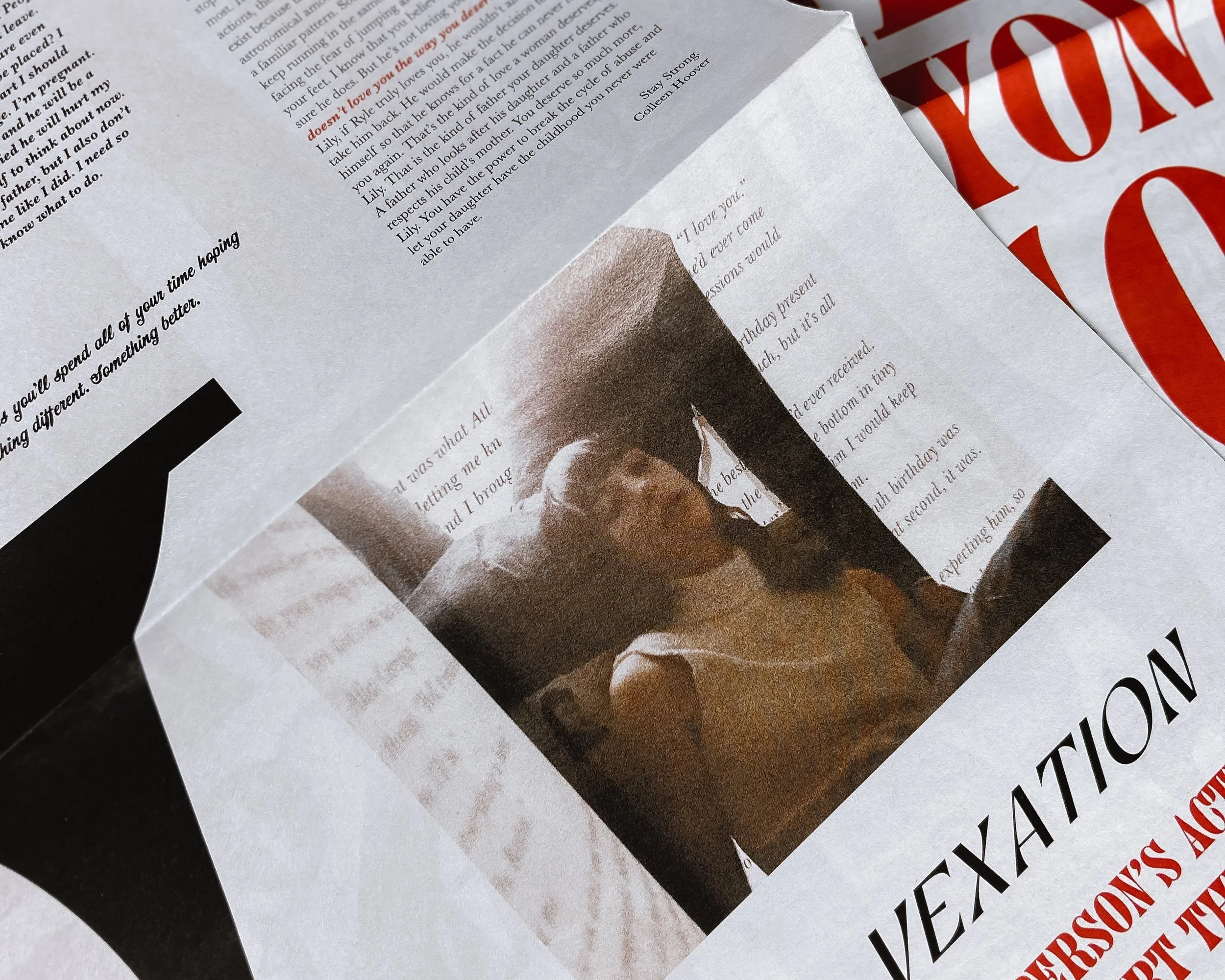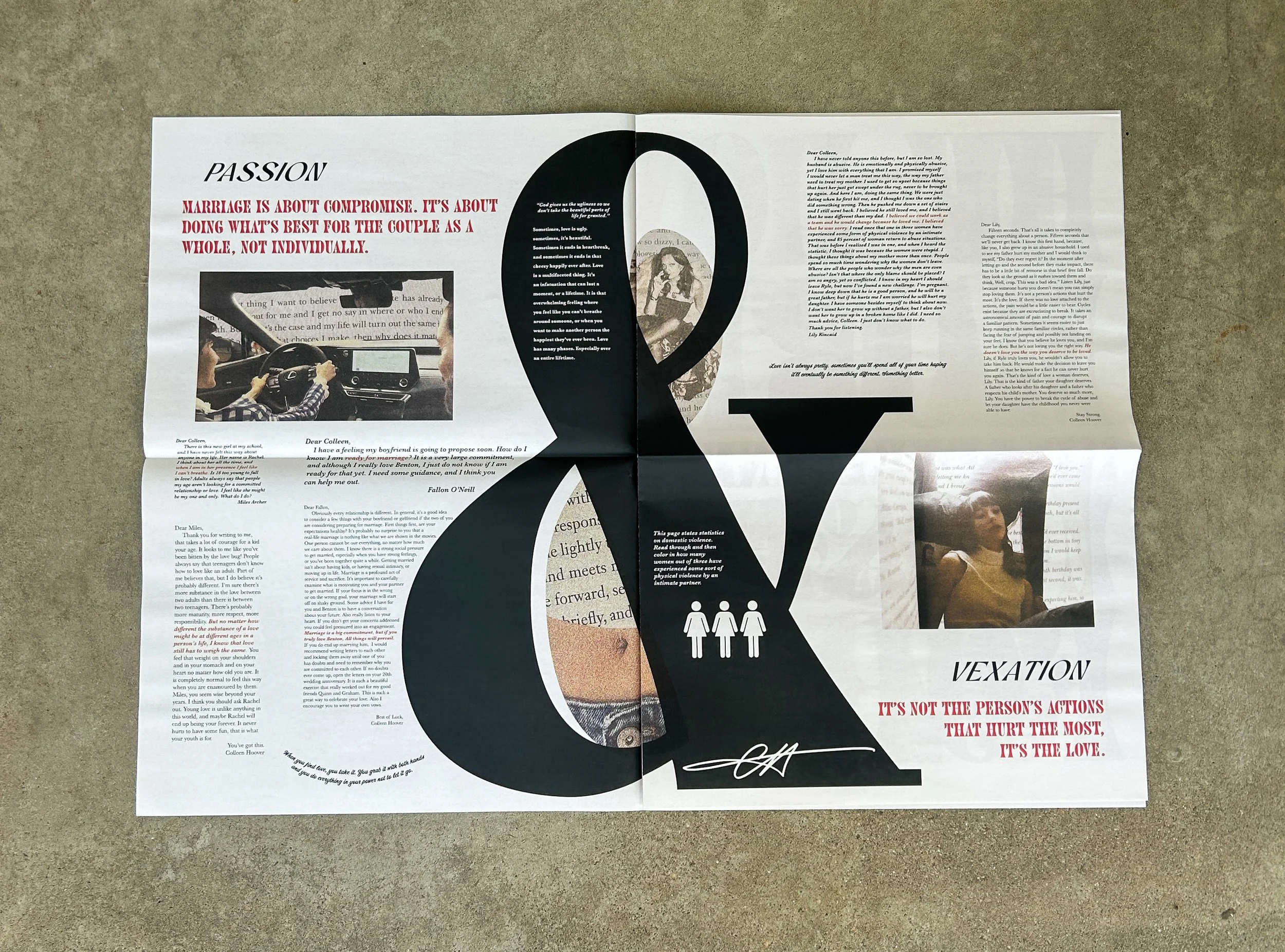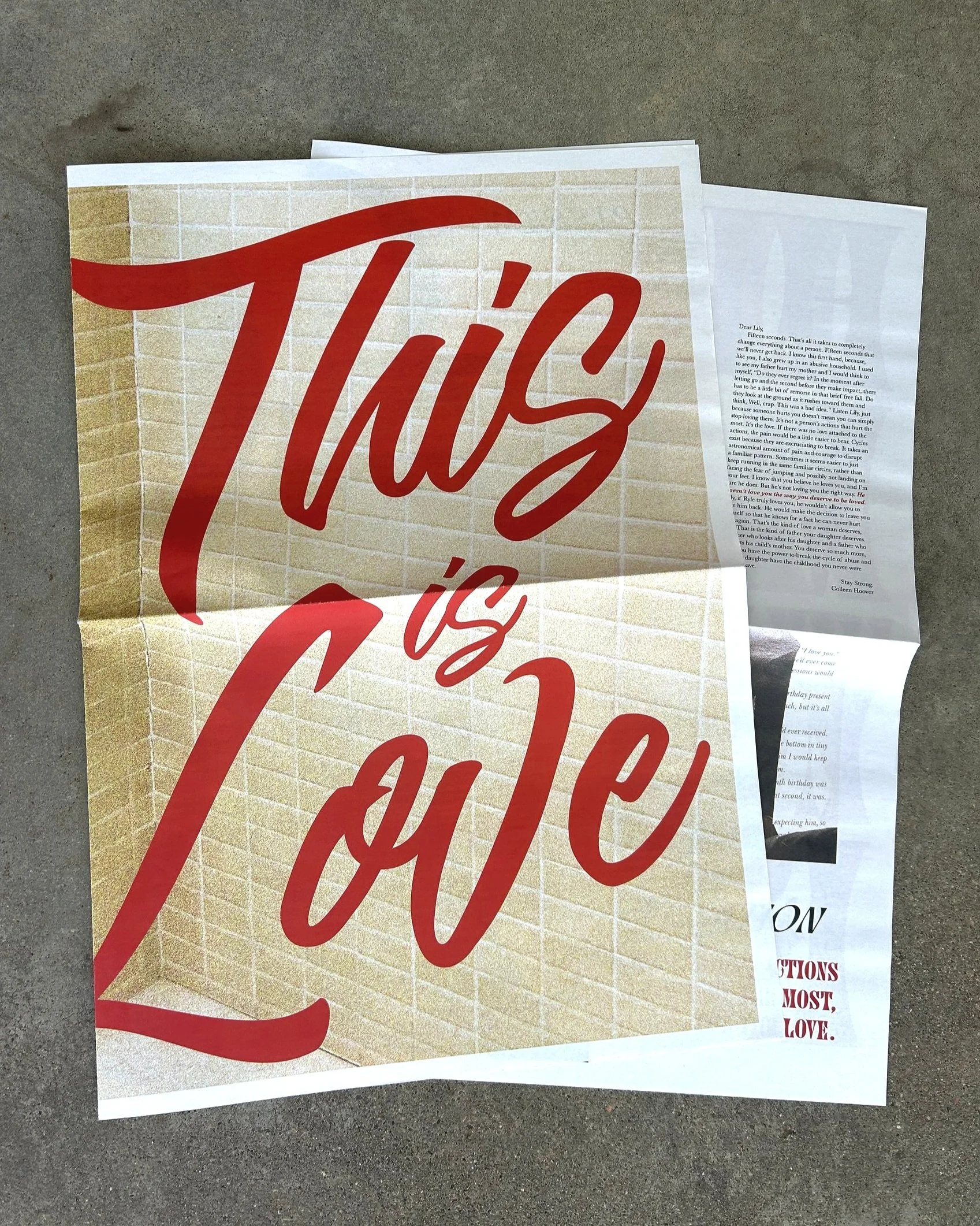 “This is Love” is a broadsheet publication focused on typography, which delves into the topic of relationships. Inspired by the writing of author, Colleen Hoover, this publication explores the topic of love. It takes a journey through all aspects of relationships, including the good, bad, and ugly. More specifically, the publication features spreads on passion, compromise, marriage, fertility, domestic violence, and heartache.