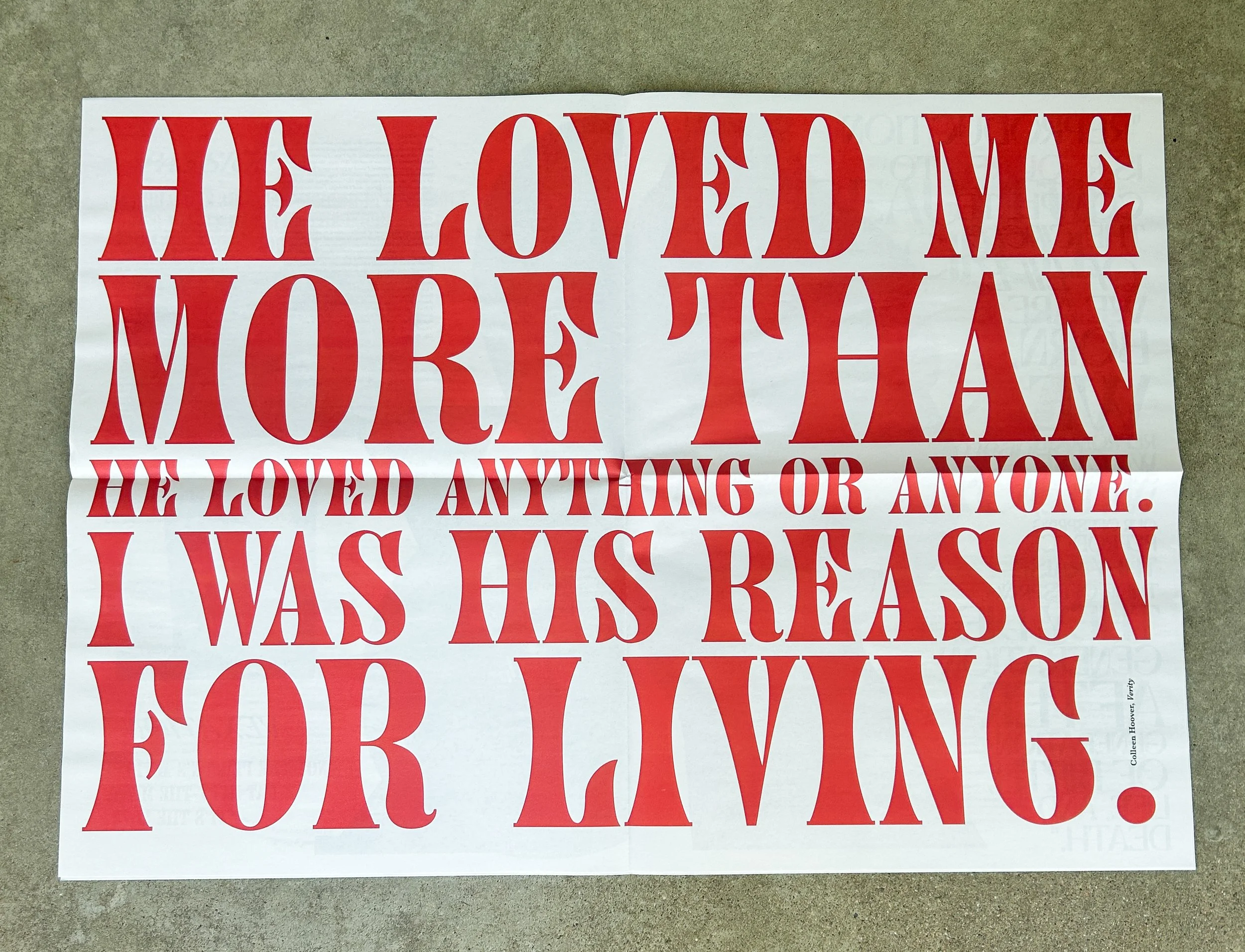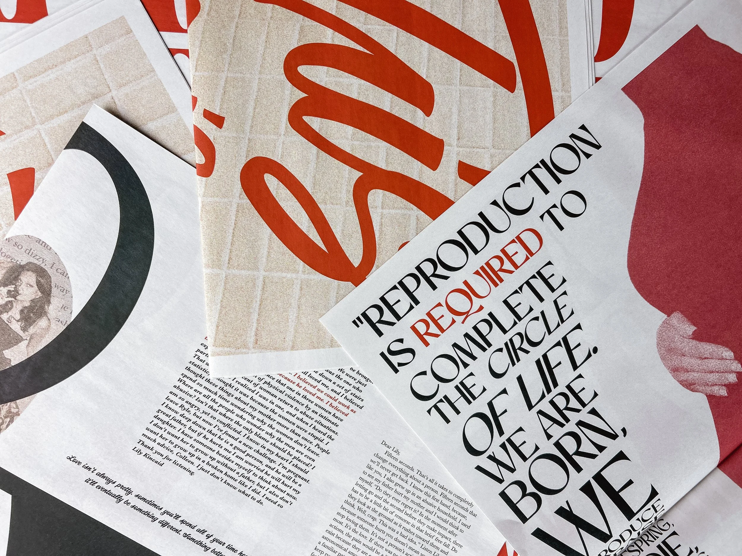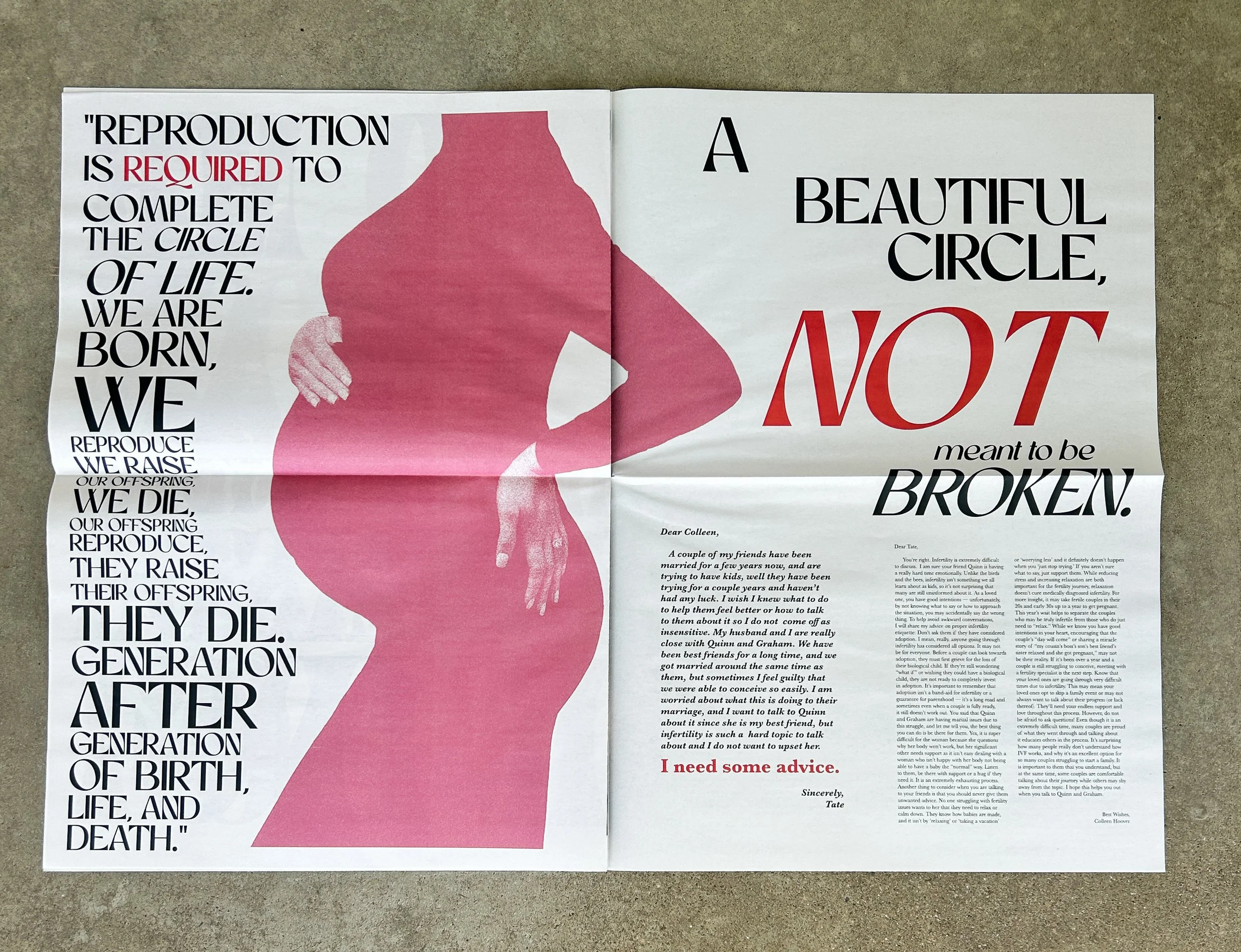 “This is Love” is a broadsheet publication focused on typography, which delves into the topic of relationships. Inspired by the writing of author, Colleen Hoover, this publication explores the topic of love. It takes a journey through all aspects of relationships, including the good, bad, and ugly. More specifically, the publication features spreads on passion, compromise, marriage, fertility, domestic violence, and heartache.